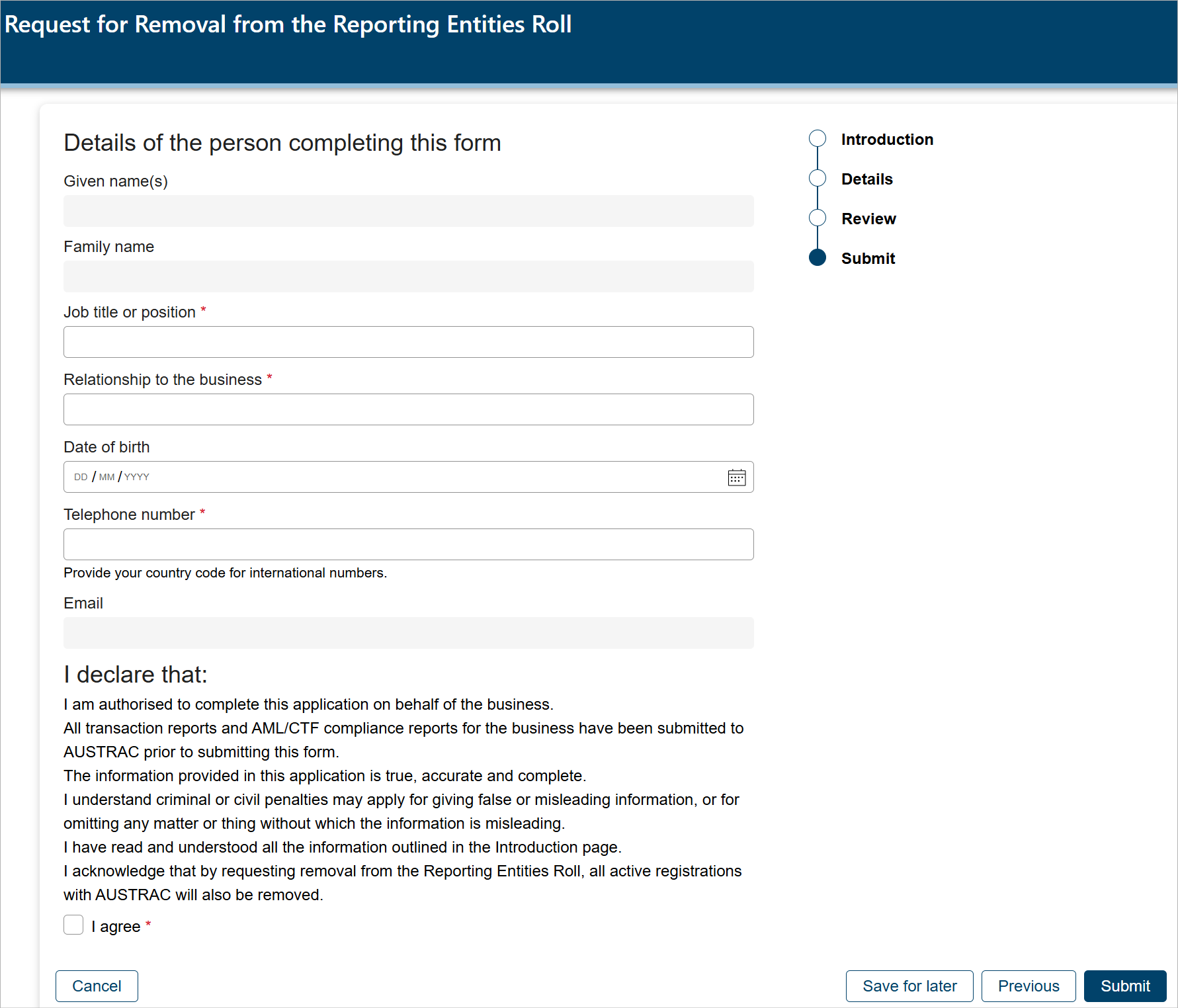 - On the submit page you will be required to complete the details of the person completing the form and the declaration section.
