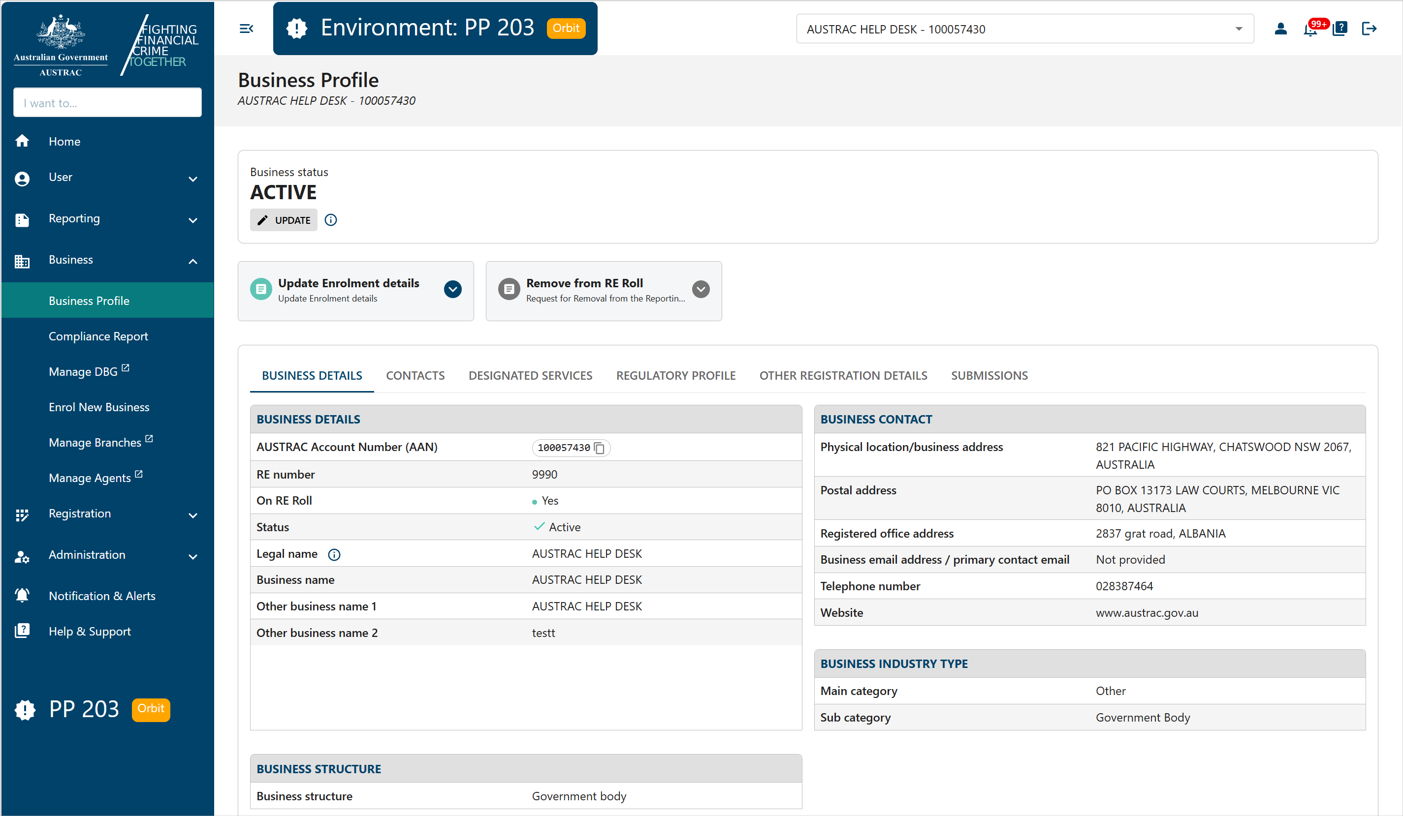 - All details for the selected business will be displayed (as shown below). Note that additional information is in the tabs on the right-hand side of the ‘Business Details’ tab.